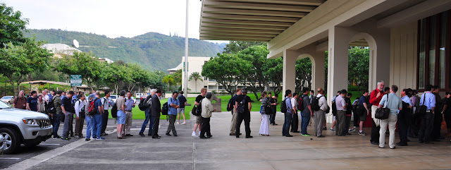 The conference venue is the University of Hawaii's "East West Center", pictured below with the line of folks waiting for registration/bag pickup.